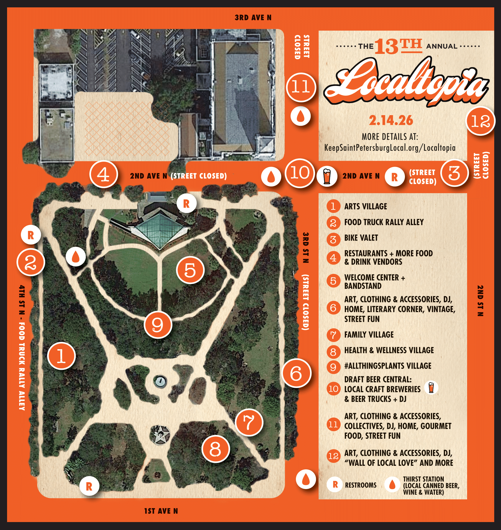 Head over to 4th Street for the “Food Truck Rally Alley,” and on 2nd Avenue is where you’ll find more food trucks + restaurants + food & drink vendors + “Local Thirst Stations” selling canned local beer, canned wine & water + our local breweries will be pouring their own brews + a local craft beer truck will be pouring your fave local beers (between 2nd & 3rd Streets). Sweet Treats & non-alcoholic beverage vendors (coffee, juice and more) will also be located on 2nd Avenue. Inside Williams Park, and along 3rd Street you’ll also find more gourmet and plant-based food and drink vendors! Plus more localiciousness for 2026 on 2nd Street (between 2nd & 3rd Avenues)!